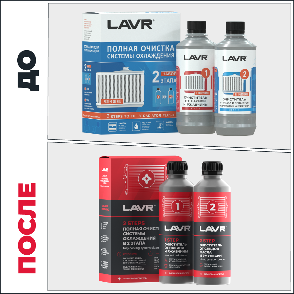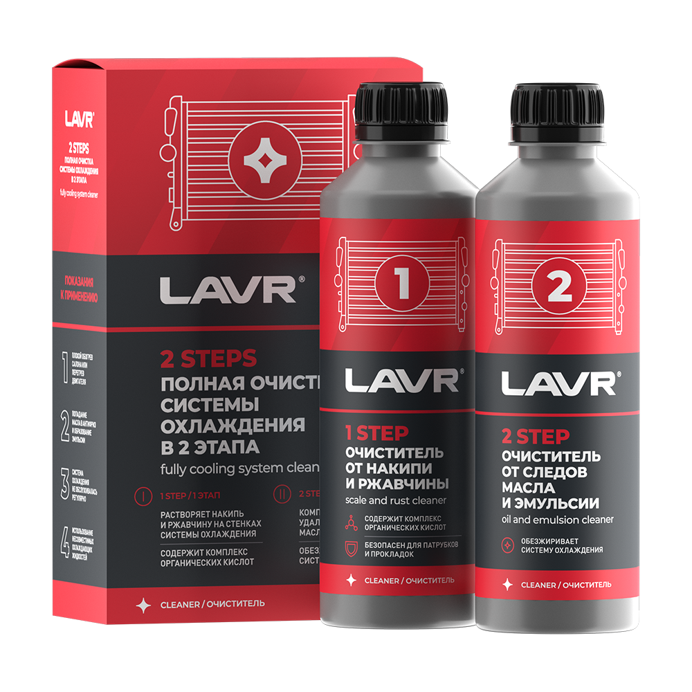 Набор Полная очистка системы охлаждения в 2 этапа – это два продукта для очистки СО от комбинированных загрязнений. На первом этапе кислотный состав растворяет неорганические загрязнения. На втором этапе щелочной состав устраняет органические остатки. В результате из системы максимально полно выводятся ржавчина, нагар, продукты распада антифриза, остатки масла и эмульсии. Подходит для всех типов систем охлаждения бензиновых и дизельных двигателей.